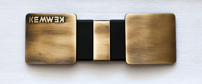 Este Kemwek, de la colección Metal, está compuesto por dos Kem (hebillas laterales) maxi de metal color bronce y un Wek (cuerpo central) con los pasadores laterales negros y el central (Indomitun) de metal color bronce.
