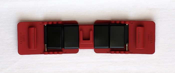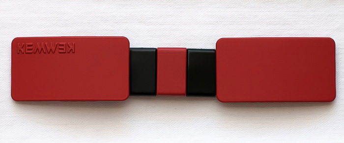 Este Kemwek, de la colección Sporty, está compuesto por dos Kem (hebillas laterales) largos de policarbonato de color rojo y un Wek (cuerpo central) con pasadores laterales negros y el central (Indomitun) de policarbonato de color rojo.