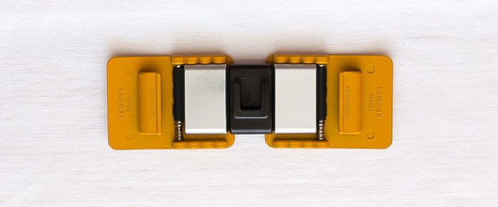 Este Kemwek, de la colección Sporty, está compuesto por dos Kem (hebillas laterales) cortos de policarbonato de color amarillo mostaza y un Wek (cuerpo central) con los pasadores laterales plateados y el central (Indomitun) de metal color bronce.