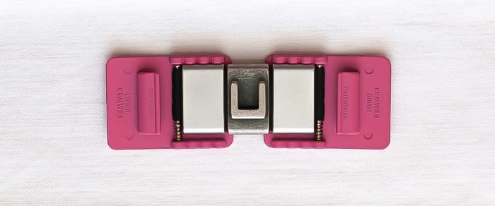 Este Kemwek, de la colección Sporty, está compuesto por dos Kem (hebillas laterales) cortos de policarbonato de color fucsia y un Wek (cuerpo central) con los pasadores laterales plateados y el central (Indomitun) de metal color plata.