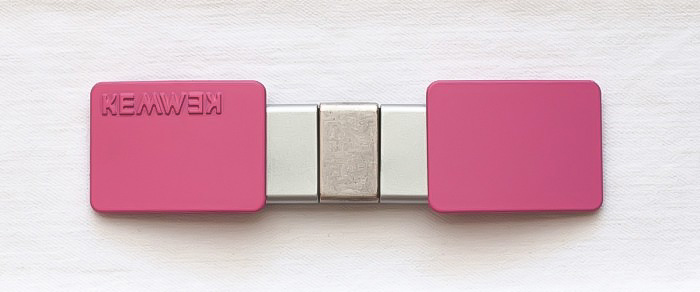 Cada Kem tiene un tamaño de 6 cm x 4,4 cm y un peso aproximado de 50 gramos. Están provistos en su parte posterior de dos pestañas que se enganchan a las trabillas de la prenda y de cuatro posiciones de regulación para graduar la longitud del Kemwek.