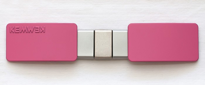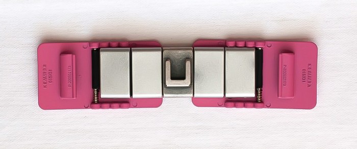 Este Kemwek, de la colección Sporty, está compuesto por dos Kem (hebillas laterales) largos de policarbonato de color fucsia y un Wek (cuerpo central) con los pasadores laterales plateados y el central (Indomitun) de metal color plata.